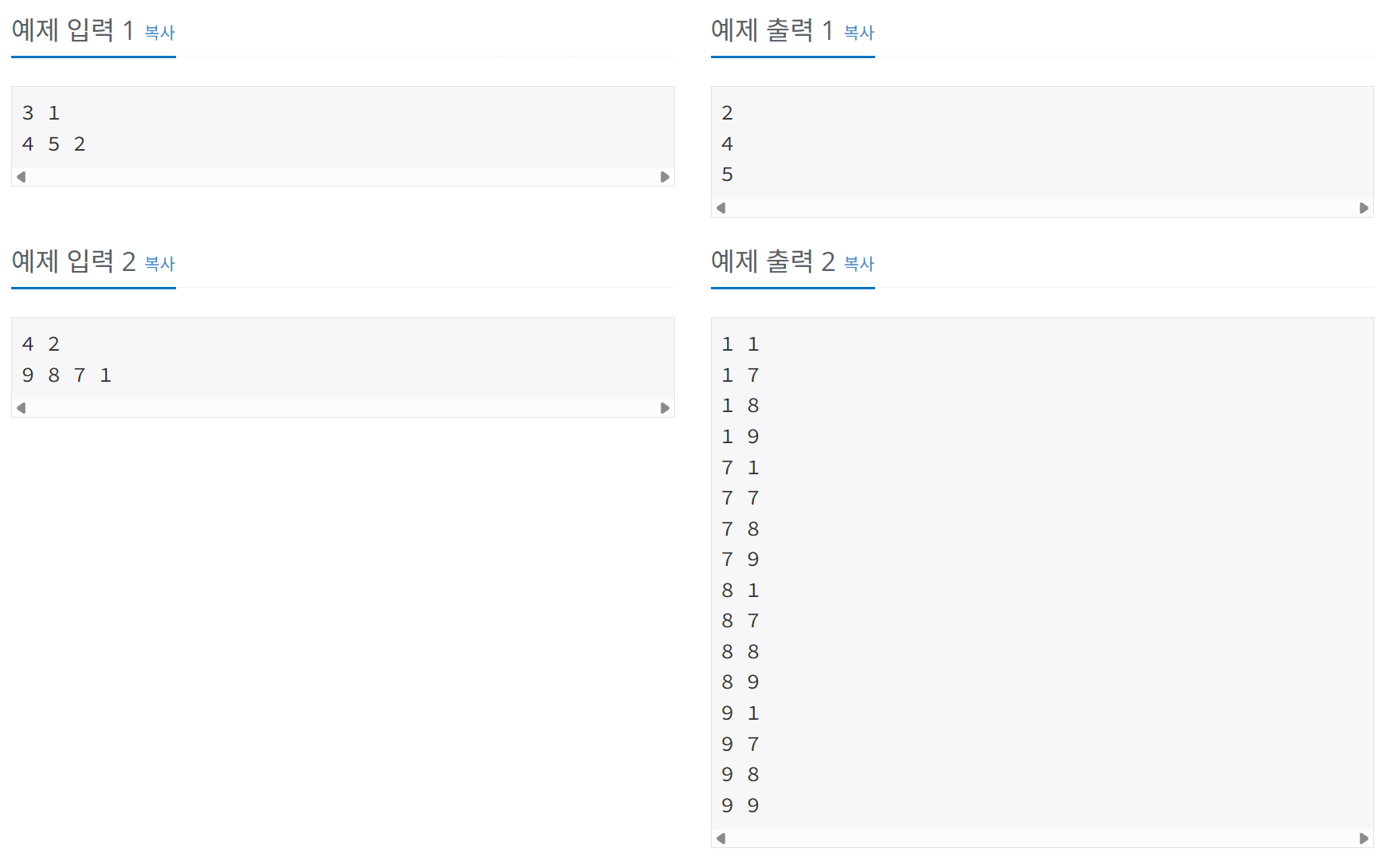 문제 문제접근 방법 해당 문제는 1~N까지의 자연수 중에서 M개를 고른 수열을 출력하는 프로그램을 작성하는 문제로M개를 고를때 같은 수를 여러번 골라도되지만 고른 수열은 비내림 차순이어야