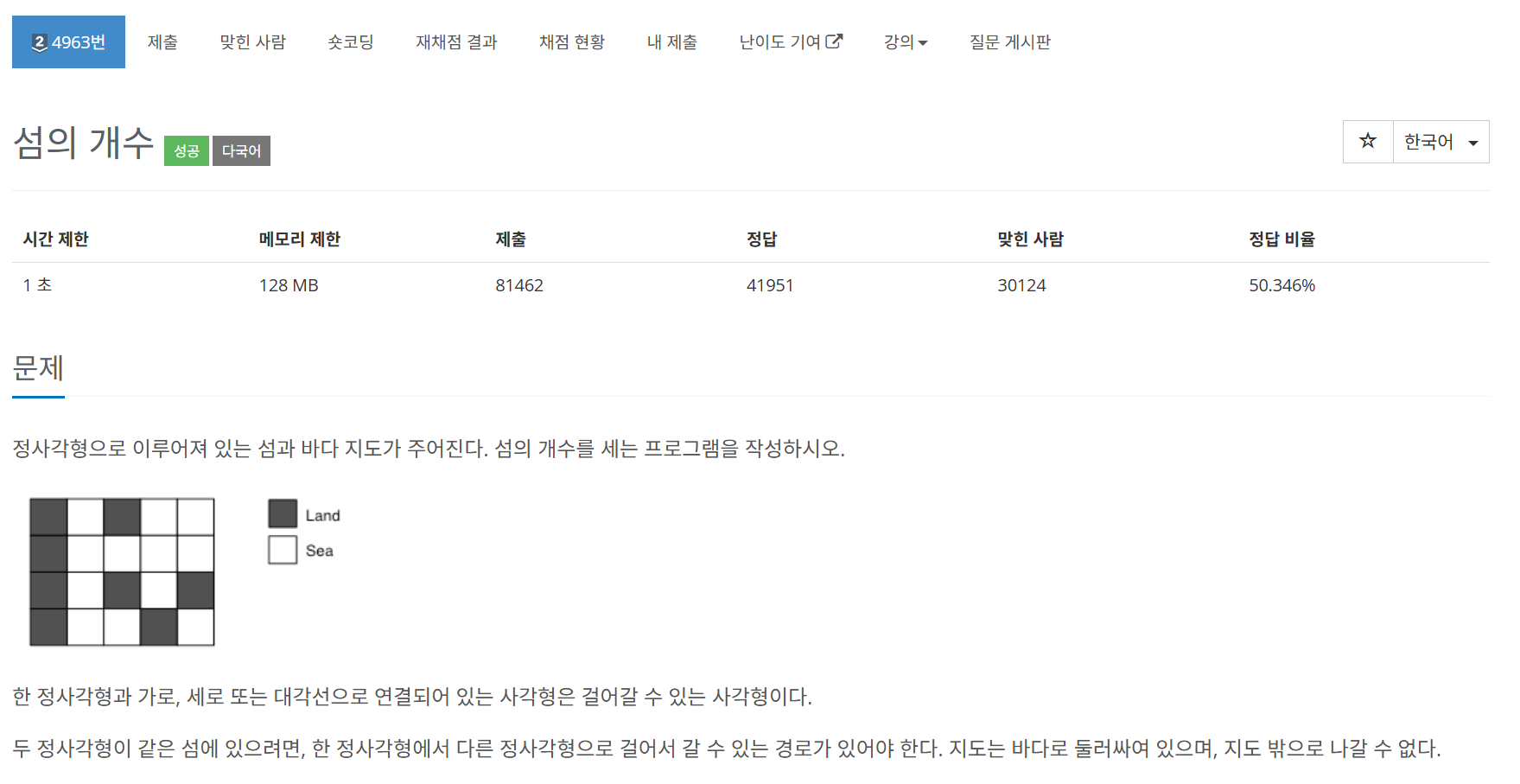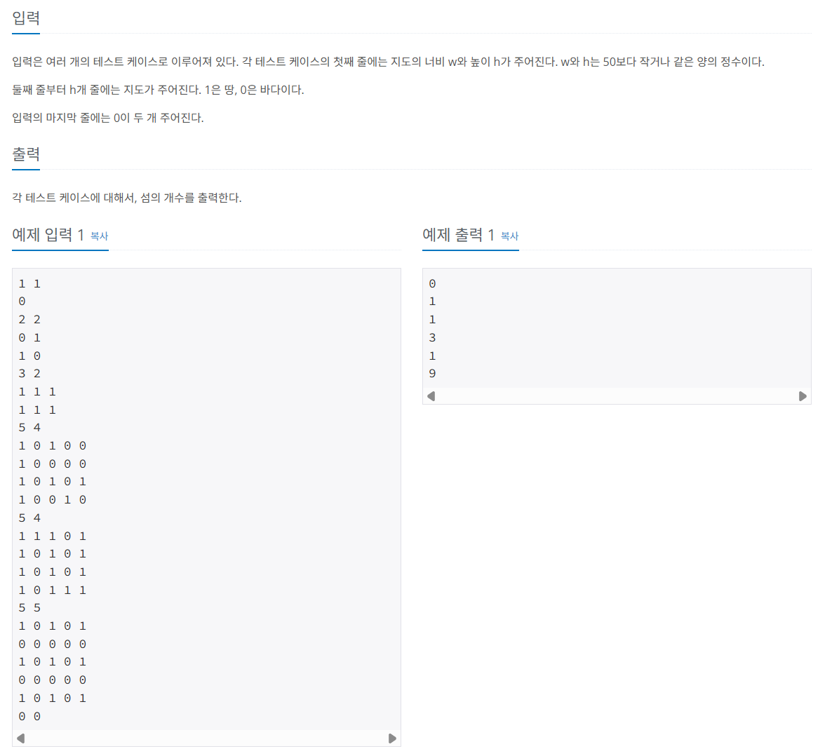 문제를 읽어보면 섬의 개수를 구해야하고 1은 땅 0은 바다를 의미한다는 것을 알 수가 있다.
