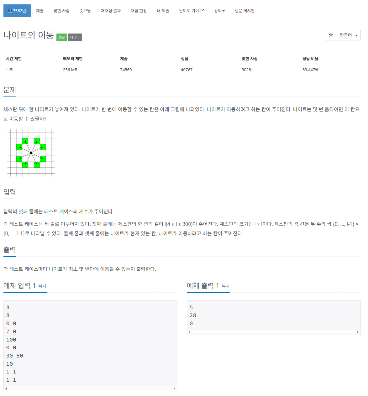 해당 문제에서는 여러 테스트 케이스들이 주어지는데 각각의 테스트 케이스들은 체스판의 크기 l(체스판은 l x l 크기), 시작 좌표와 이동하려는 좌표 값이다. 해당 값들을 가지고 l x l 크기 체스판에서 나이트가 시작점에서 이동하려는 점까지 최소 몇 번 만에 이동하는지를 구하는 프로그램을 작성하는 것이 본 문제의 요구사항이다.