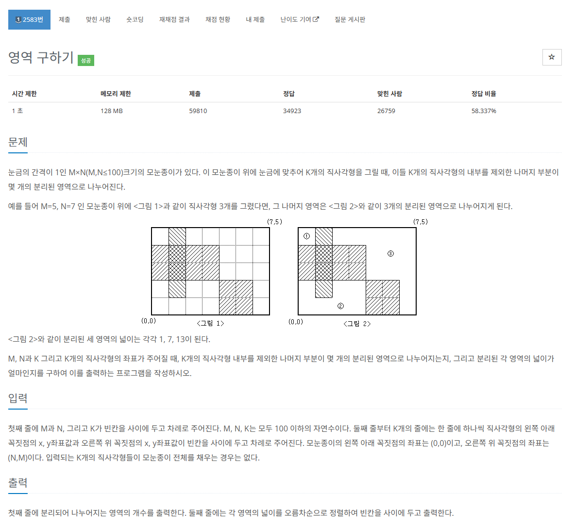 해당 문제는 m x n크기의 종이가 있다고 할 때 m, n, k를 입력받고 종이에 직사각형을 k 그리는데 직사각형의 왼쪽하단 값과 오른쪽 상단값이 주어져 직사각형을 이룬다. 이때 직사각형이 종이에 그려지면 직사각형을 제외한 나머지 구역들이 나누어지는데