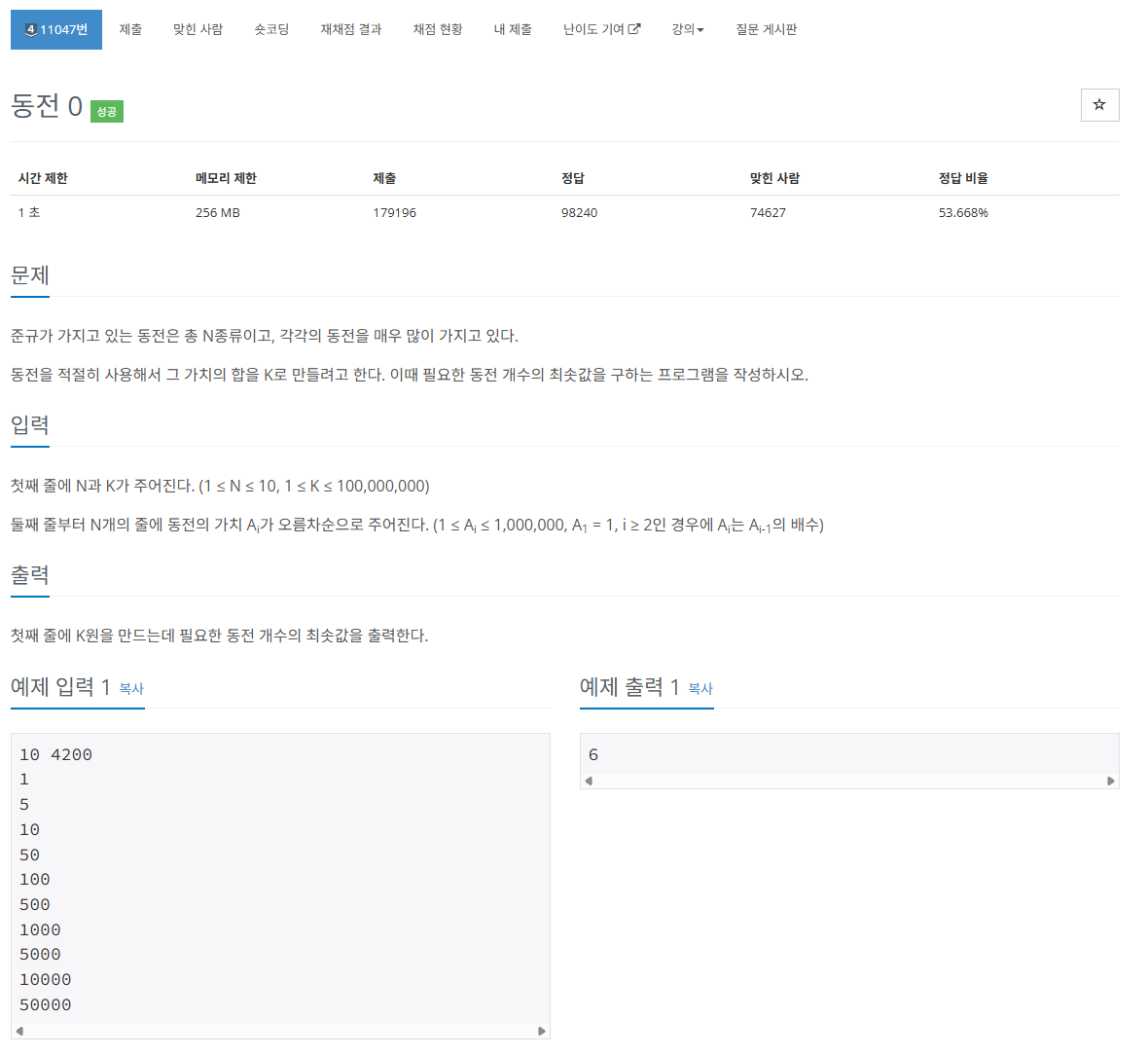 해당 문제는 동전의 개수와 만들려고하는 합 두 값을 입력받고 각각 동전의 가치를 입력받아 동전을 조합해 만들려고 하는 합을 만드는데 필요한 동전의 최소 개수를 출력하는 프로그램을 작성하는 문제이다.여기서 각각의 동전의 가치는 오름차순으로 주어지고 배수관계이다.